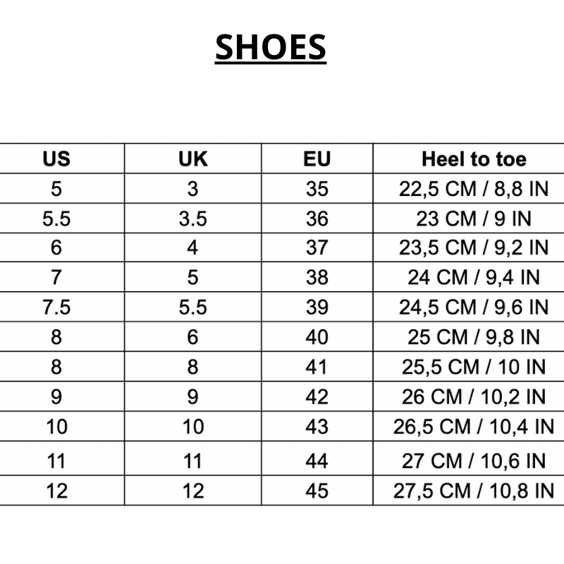 EU Size Foot Length(cm) US Size UK Size AU Size